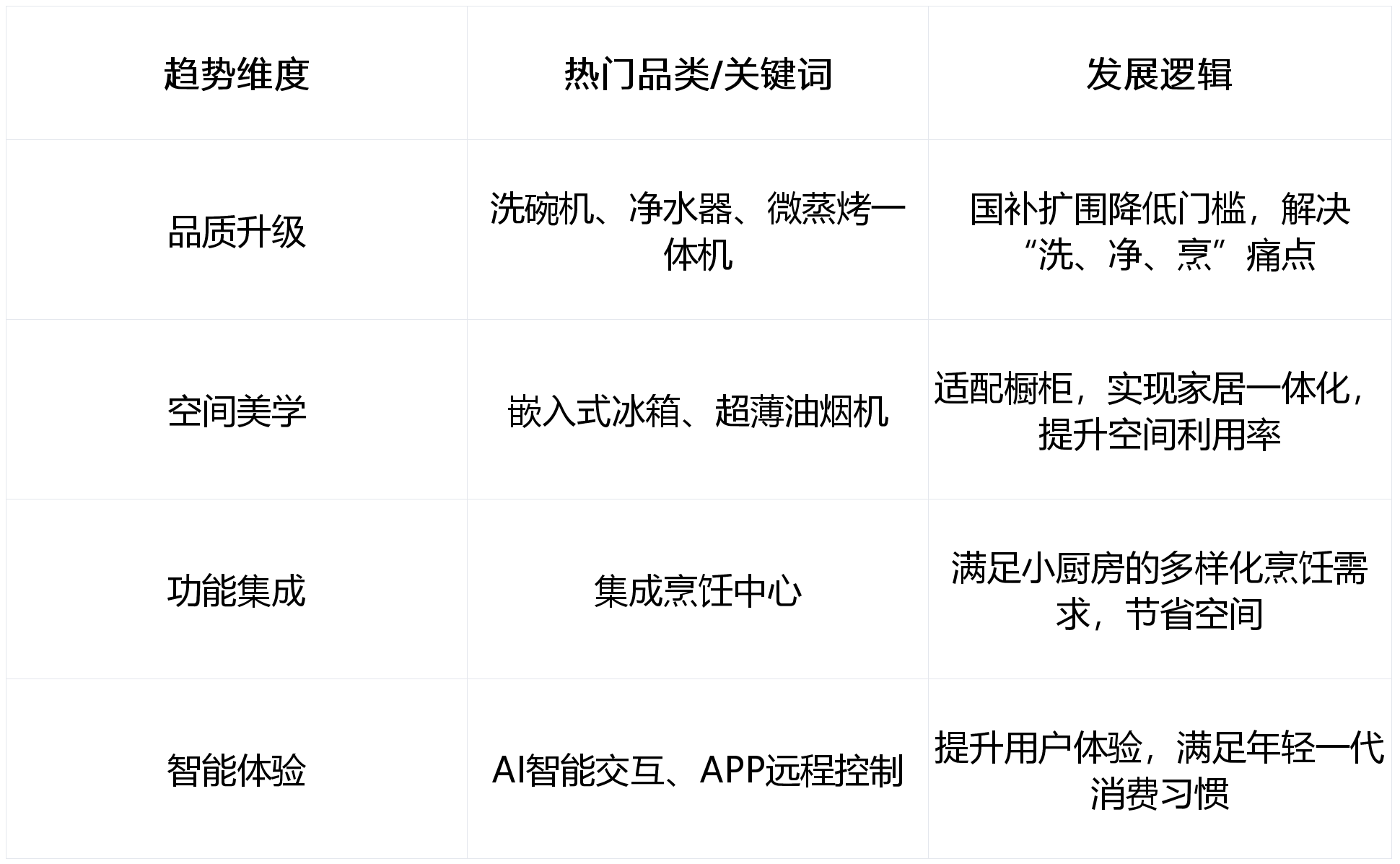 无望送来迸发式增加。已成为行业通用的营销闭环。是2025年行业成长的最大变量。补助政策的落地将大幅降低消费门槛,绿色节能也是政策和市场配合关心的核心,薄型油烟机、全嵌入式洗碗机、平嵌冰箱等产物因能处理保守厨房空间狭小、结构芜杂的痛点而备受逃捧。深切分解2025年中国厨房家拆行业的周期切换、政策盈利、场景及渠道沉构,“厨房翻新”、“旧房”等环节词的热度持续攀升,